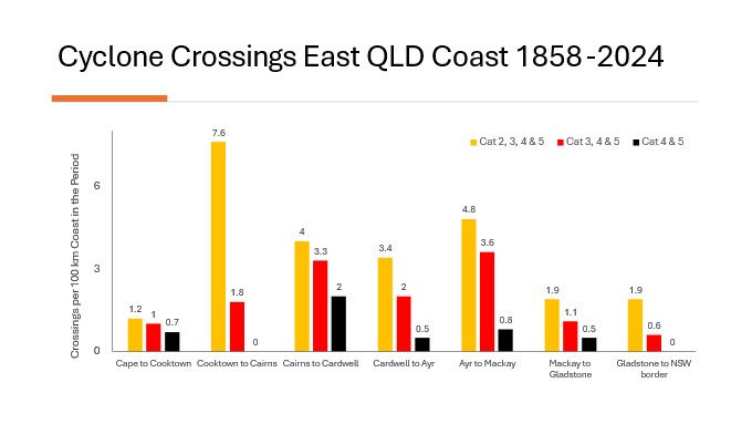 The Bureau of Meteorology observes and reports on an average of 10 cyclones across northern Australia every year. Each season, an average of three are monitored for Queensland's east coast. The vast majority of these are not intense at landfall, or do not cross the coast. For every 20 storms tracked by BoM, only one crosses the coast as a Cat 2+. For our region, Cat 2+ crossings are a 1 in 29 year event.