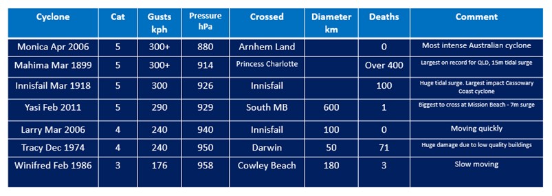 The first major event for us was the 1918 cyclone that crossed Innisfail. That one and three recent cyclones all caused major damage in Mission Beach. We can compare these with the largest ever cyclone crossing the Queensland coast (Mahina, 1899) as well as the largest to cross the coast anywhere in Australia (Monica, Arnhem Land, 2006). I will add Cyclone Tracy of 1971 to the comparison as it is remembered by many.