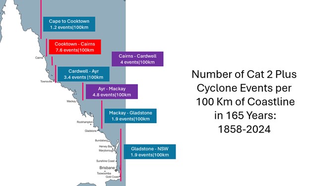 From 1858 to 2024, the stretch of the east QLD coastline that had the greatest number of Cat 2 to Cat 5 cyclone strikes per 100 kilometres of the coast was the Cairns to Cooktown sector with 7.6 Cat 2+ cyclones/100 km. While the Cairns to Cardwell sector has been hit most often in recent years, it is moderate for the entire period at 4 events per 100 km.